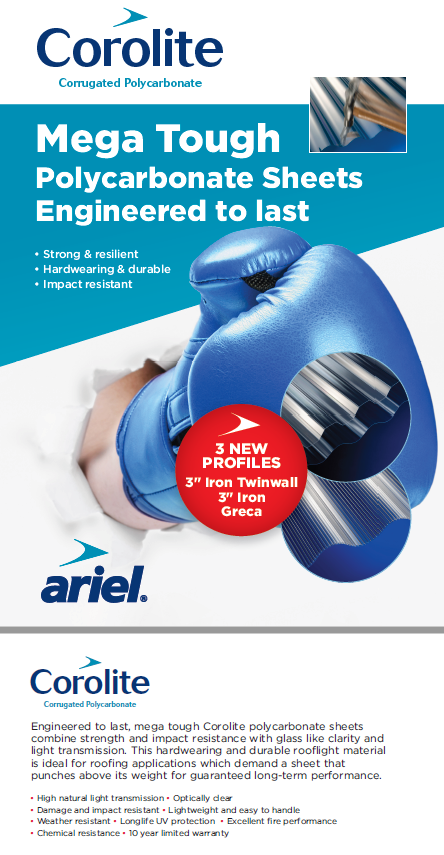 Once installed, Corolite Mega Tough will also provide long-life UV protection, excellent fire performance and chemical resistance to improve the longevity and resilience of the product. When fitting, make allowances for thermal movement, and when drilling holes for fixings, ensure that they're oversized.